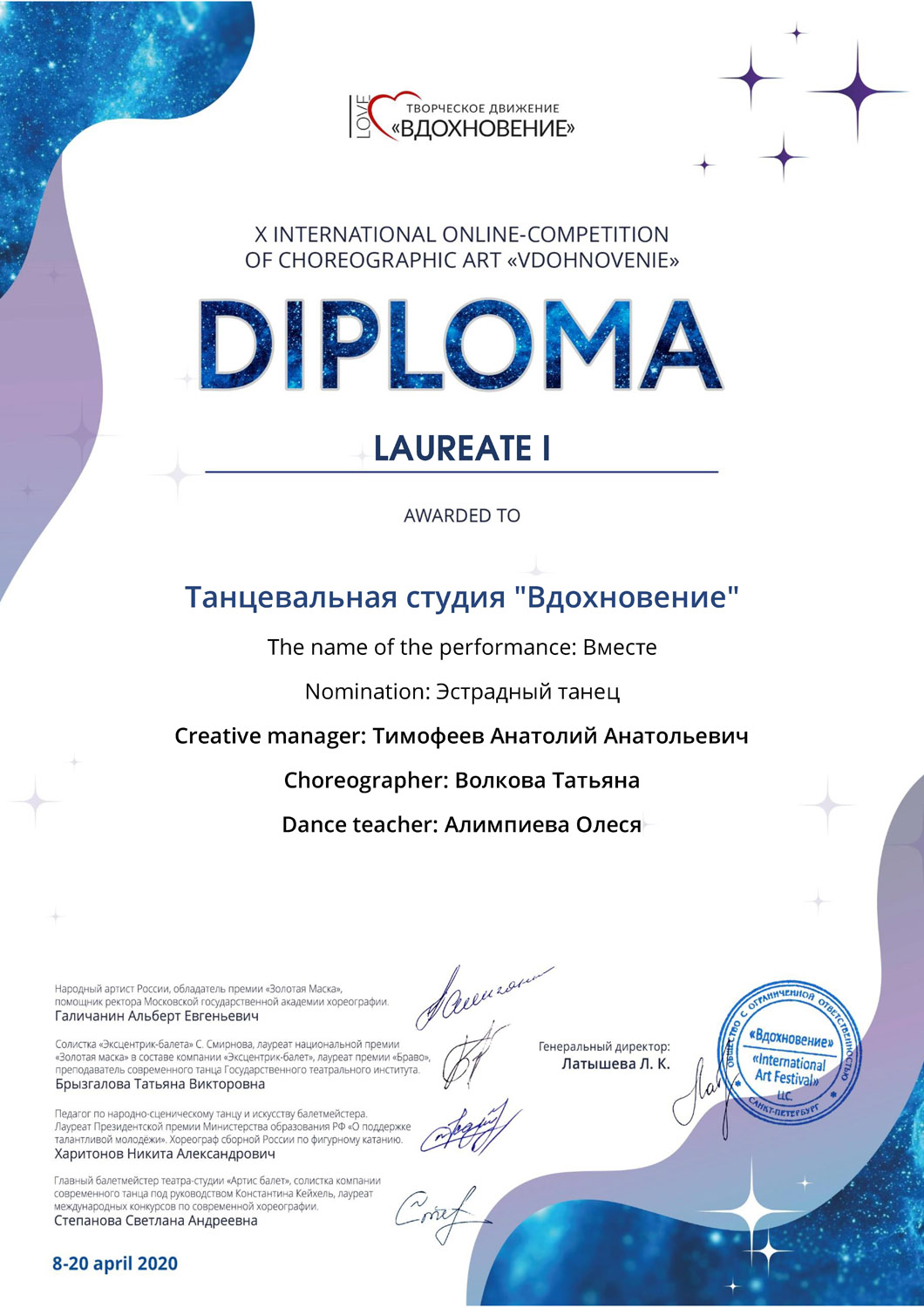 Ещё до объявления режима самоизоляции танцоры успели отснять видеоролики номеров. В записи принимали участие 16 пар, поэтому подходящей площадкой для съемки стал просторный актовый зал XIII корпуса СНИГУ им. Н.Г.Чернышевского. Видеоролики танцоров не оставили равнодушными членов жюри, танцевальный номер «Для тебя» становится Лауреатом 1 степени, а номер «Вместе» заслуживает Гран-при.